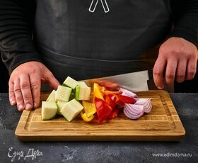 Цукини, красный лук и болгарские перцы нарежьте крупными кусками. Чеснок не очищайте.
