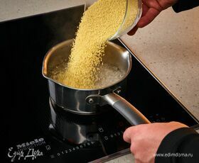 На панели конфорок Miele доведите воду до кипения на режиме Booster 2 (нажмите на уровень нагрева 9, держите, пока рядом с цифрой 9 не появится двоеточие). После закипания выключите, засыпьте кускус и оставьте настояться.