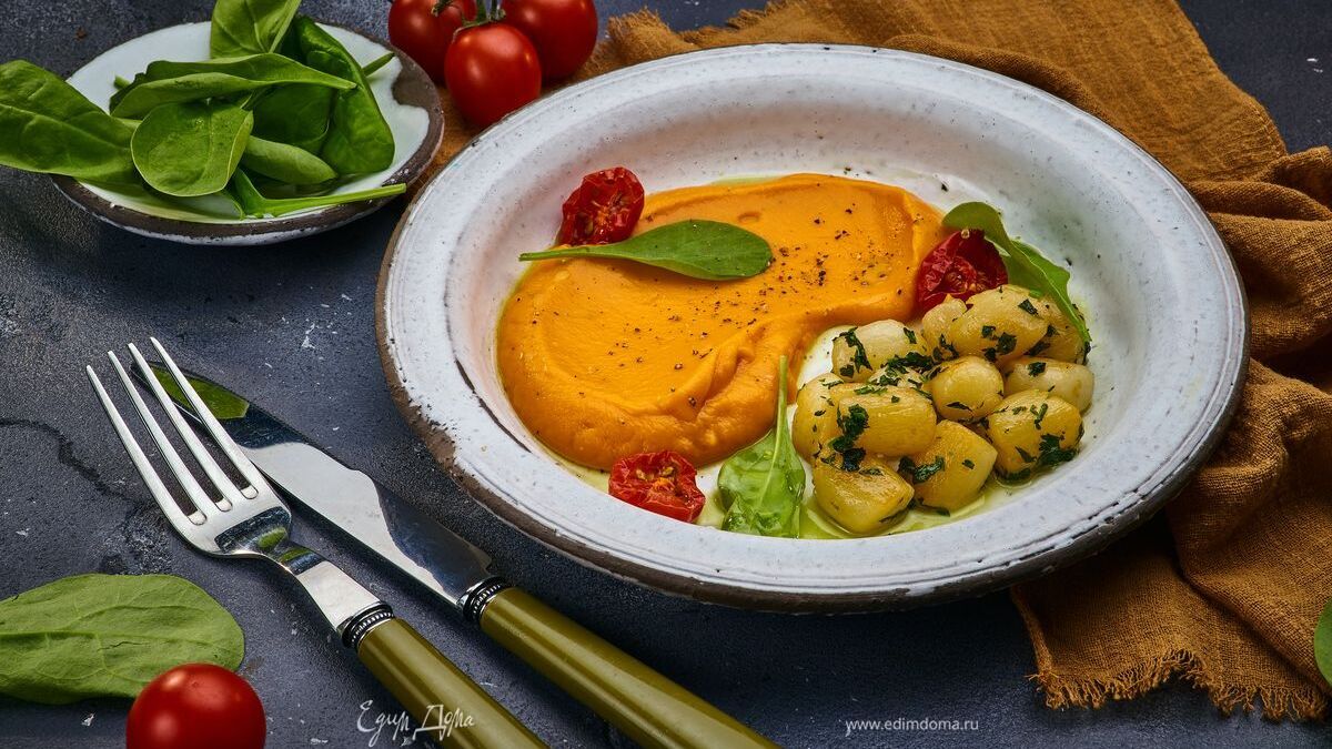 Подавайте гребешки с пюре из батата, украсив зеленью.