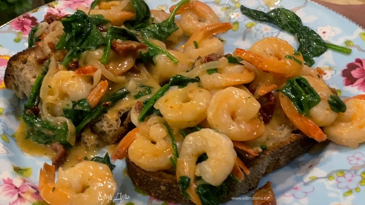 Готовые креветки вместе с соусом выложить на хлеб и подавать.