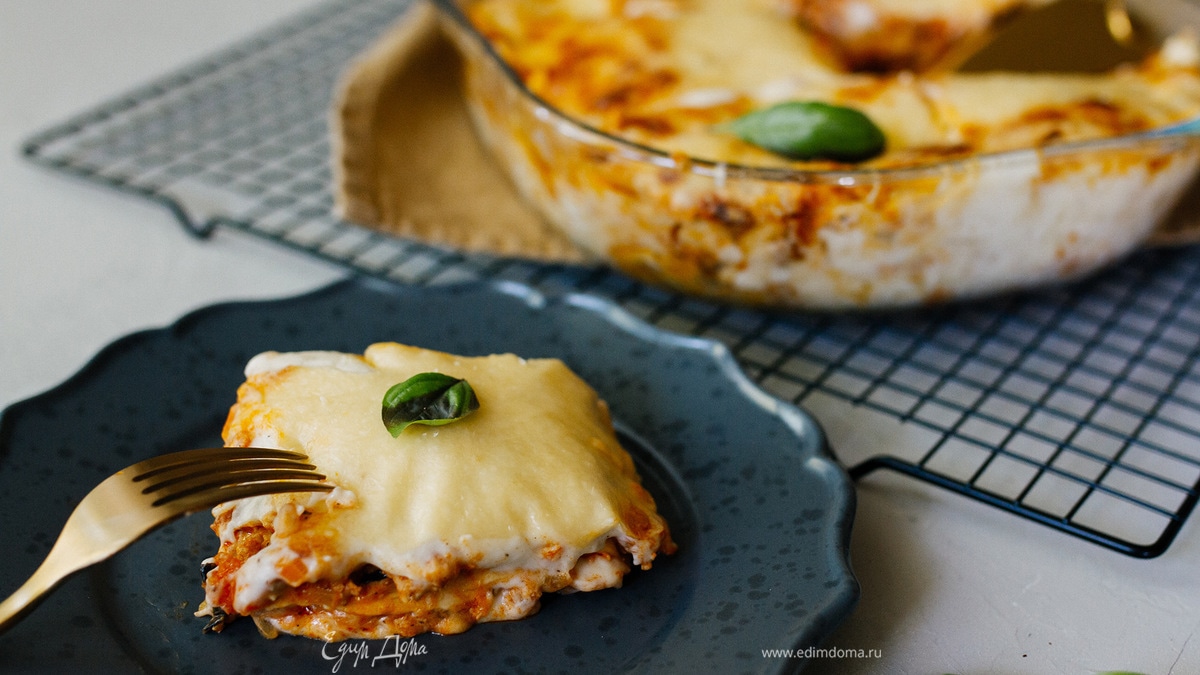 Готовой лазанье дать время остыть (10 минут хватит), и можно нарезать на кусочки и подавать. Приятного аппетита!