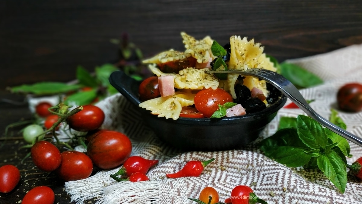 Очень вкусная летняя паста с ветчиной, помидорами и ароматными травами будет хороша как на завтрак, так и на перекус в любое время дня.