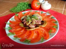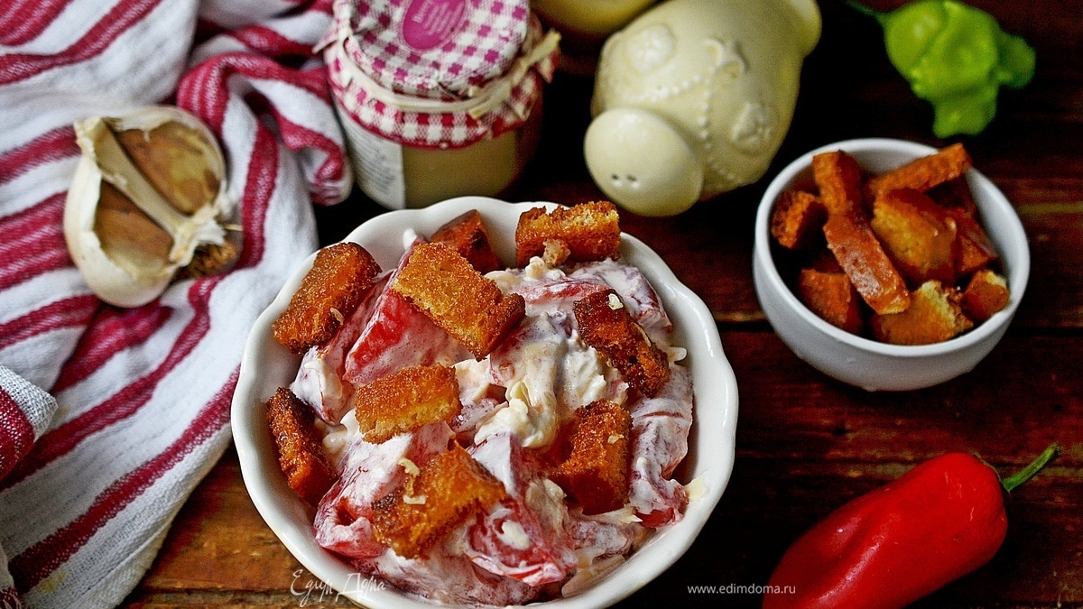 Простой, но эффектный и сытный салатик. Ничего сложного во вкусе и приготовлении нет. Изюминку блюду придают чесночные сухарики, с которыми подается салат.