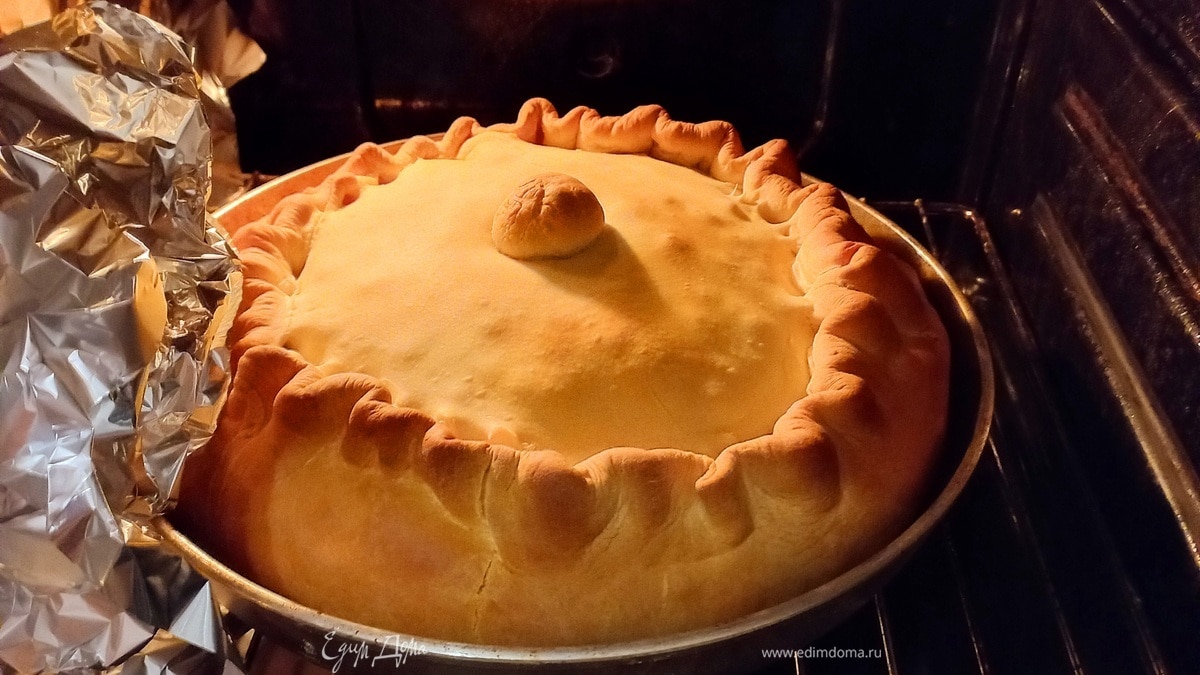Сверху по центру кладем вторую часть теста и соединяем с краями основной части. Эстетика и красота зависят от вашей фантазии. В самом центре делаем небольшой разрез и формируем дырочку, которую закрываем шариком. Сверху на колпачке вилкой можно сделать небольшие дырочки. Это позволит начинке дышать. Далее в заранее (за 30–40 минут до начала готовки) разогретую духовку отправляем блюдо. - Шаг 8