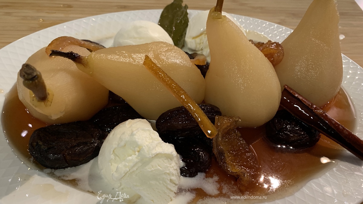 Выбирайте матовый и не очень привлекательный чернослив — если он не блестит, значит, не обработан никаким маслом. Груши должны быть целиком покрыты сиропом, поэтому выбирайте для приготовления подходящую посуду. Я подаю фрукты с ванильным мороженым, но отлично подойдет и карамельное, и взбитые сливки тоже будут вполне уместны!