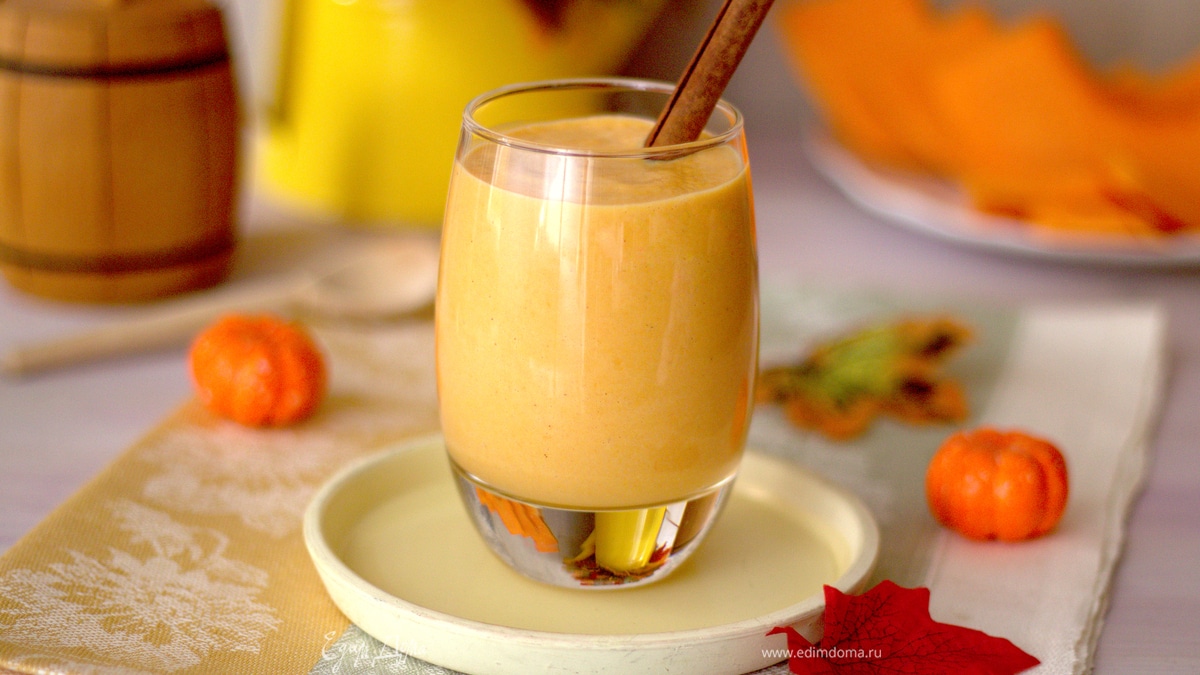 Кладем в блендер тыкву, заливаем горячим молоком, добавляем мед и специи ( (их количество можно изменить по своему вкусу). Взбиваем до однородности. Если у вас блендер недостаточно мощный или погружной и тыква не перемалывается до однородности, процедите коктейль перед подачей через сито.