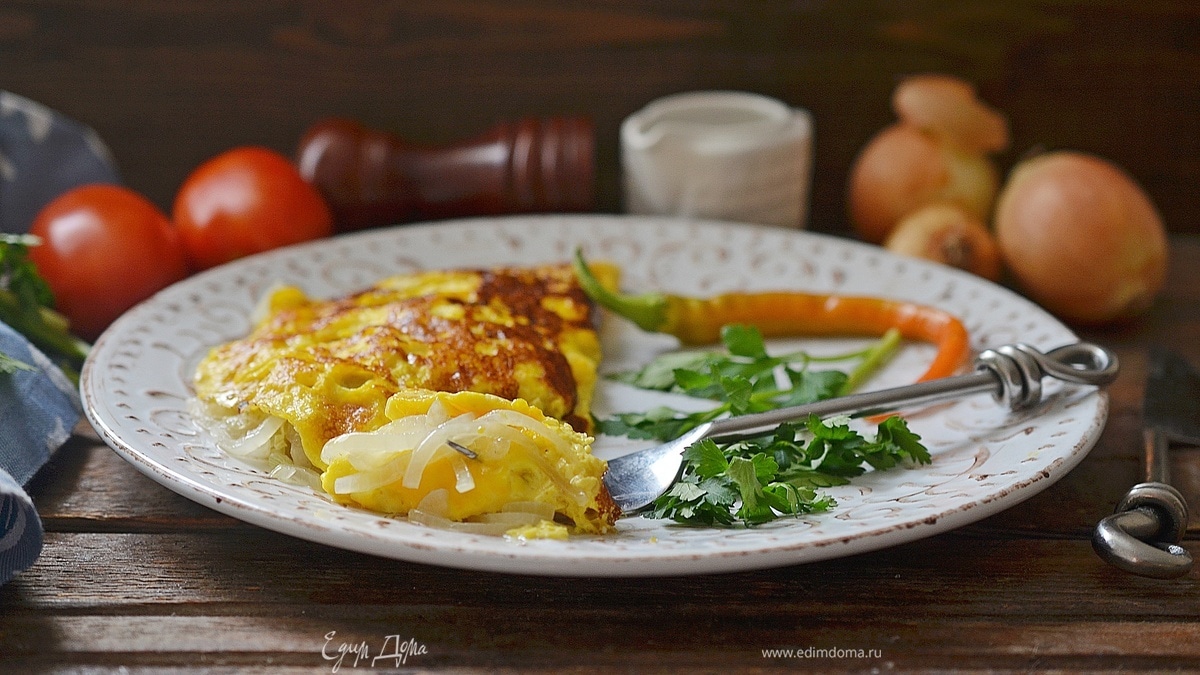Когда омлет немного схватится, на половину добавьте обжаренный лук. Накройте второй половиной омлета и подавайте к столу. - Шаг 10