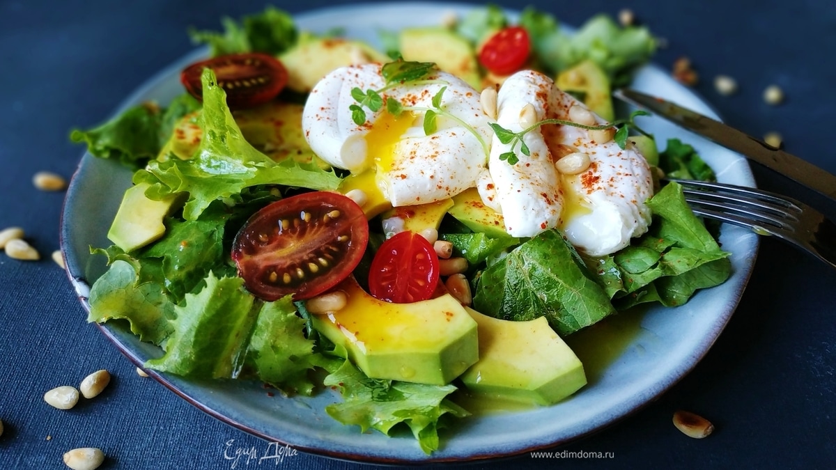 Салат с яйцом пашот, авокадо и кедровыми орешками — сытный и очень вкусный — будет отличным началом вашего дня.