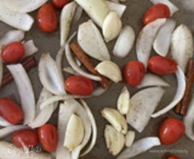 В противень или другую посуду для запекания выкладываем помидоры, головку очищенного чеснока, лук-шалот, нарезанный на 4 части, 3 палочки корицы, кориандр. Поливаем оливковым маслом, перемешиваем хорошенько и отправляем запекаться в духовку на 40–45 минут при 160°C. На фото белый лук, но нужен именно шалот красный. Так вкуснее.