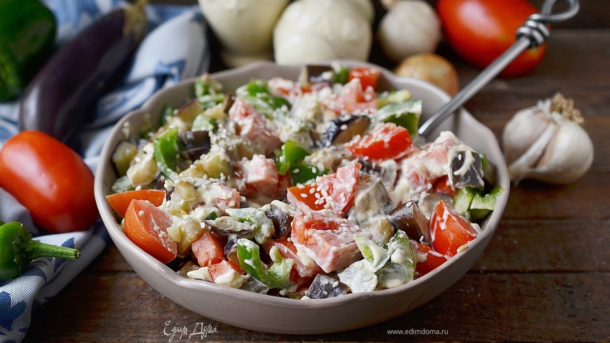 Теплый овощной салат с баклажанами вполне может заменить основной прием пищи: он сытный, сбалансированный и полезный. Подавайте салат, пока баклажаны теплые.