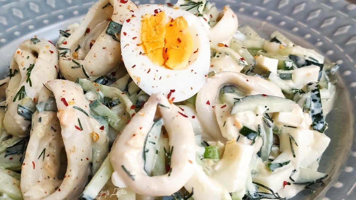 - Шаг 1Кальмары (лучше брать уже очищенные) отварить пару минут в подсоленной воде.