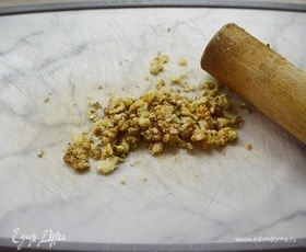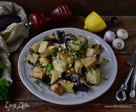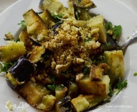 Теплый салат из хрустящих жареных баклажанов с грецкими орехами и петрушкой.