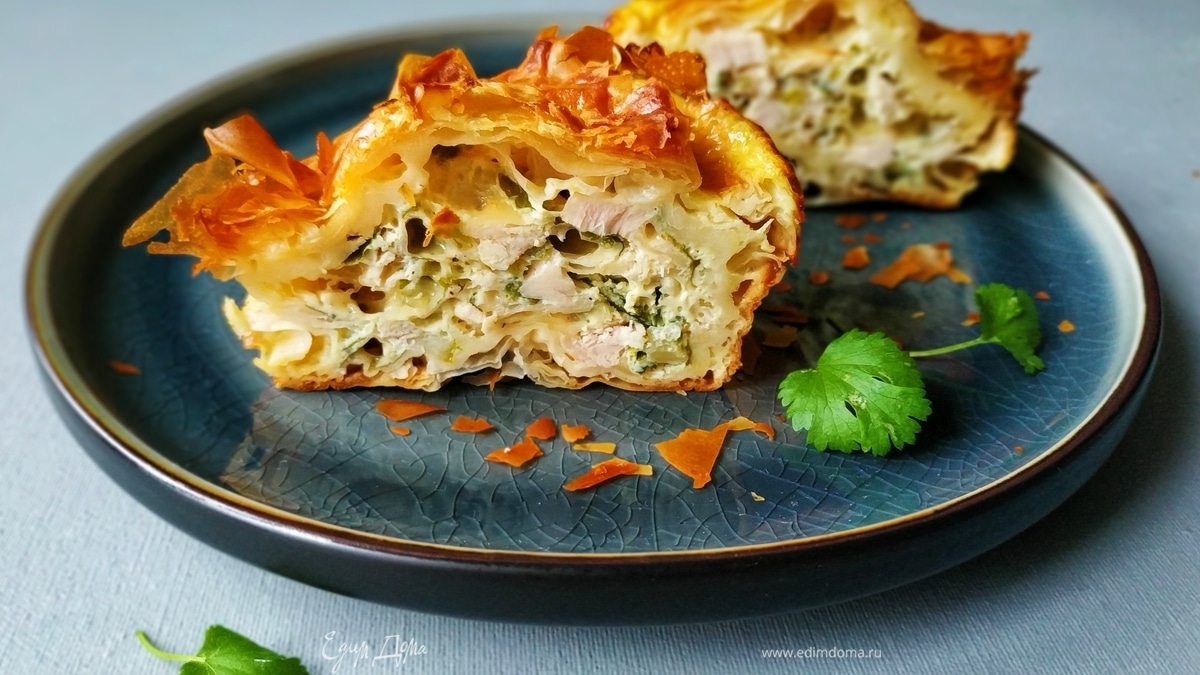 Начинку прикройте тестом, смажьте яйцом. Выпекайте в духовке при температуре 170°C 35 минут. Следите, чтобы тесто фило не пригорело. - Шаг 6
