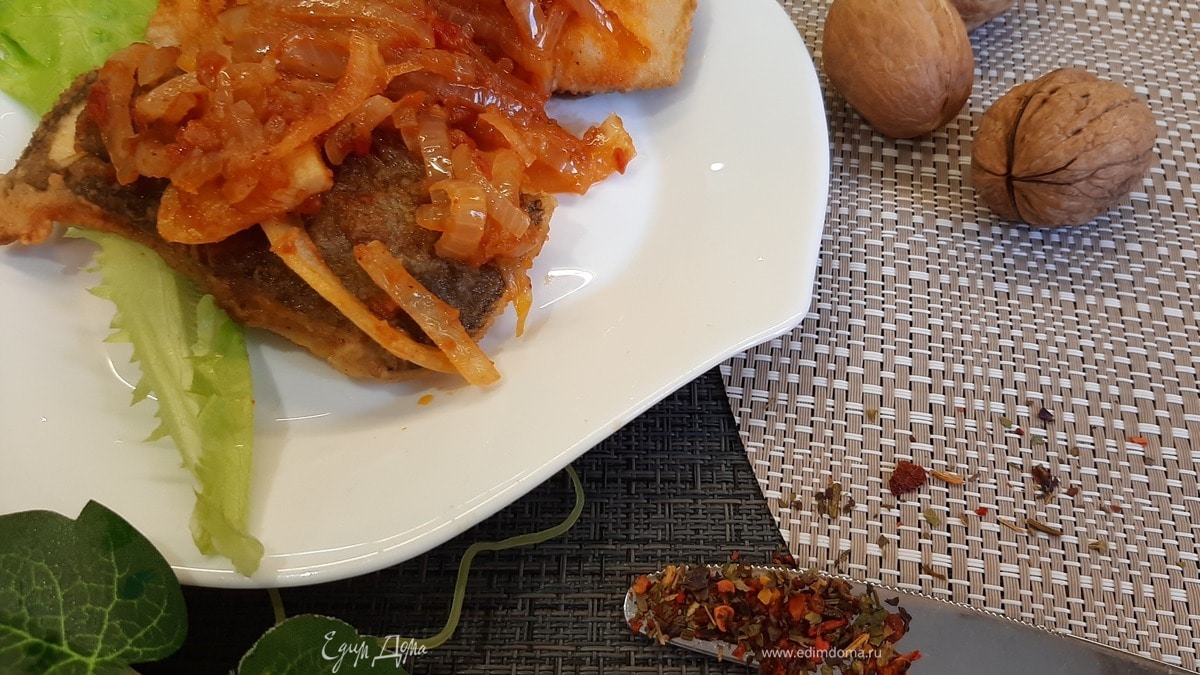 На тарелку выложить камбалу, затем — слой жареного лука. Приятного аппетита!