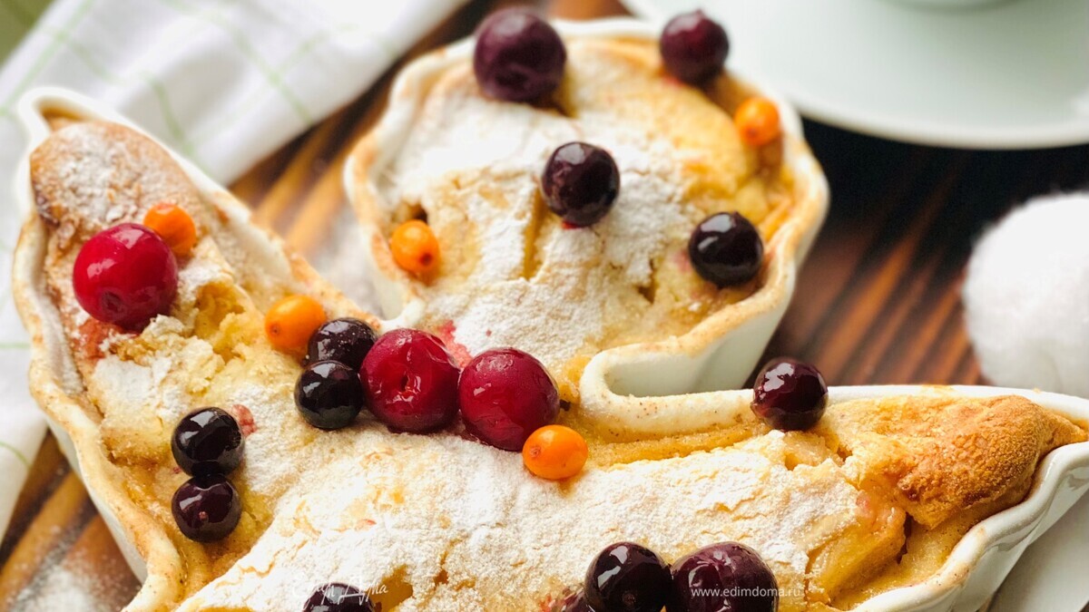 Блинчик в начале сильно поднимется, но затем естественным образом опадет. Перед подачей посыпать его сахарной пудрой и украсить ягодами.