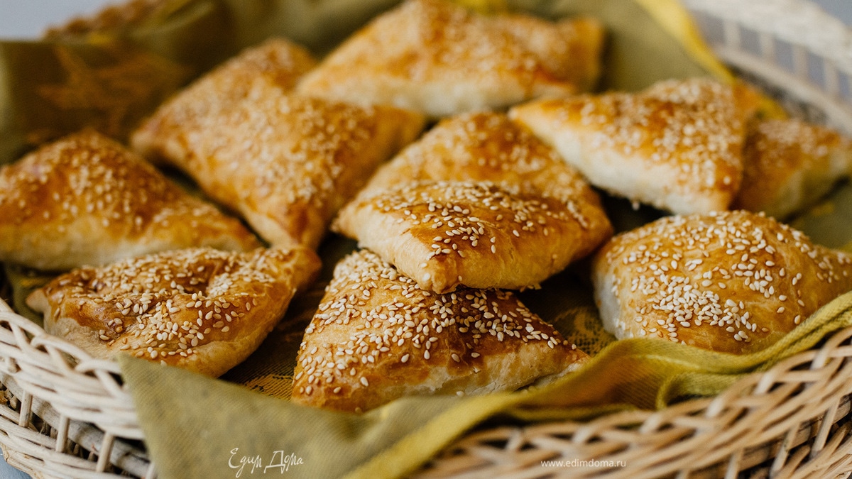Слойки выложить швом вниз на противень, застеленный пергаментом. Смазать слегка взбитым яйцом и посыпать кунжутом. - Шаг 10