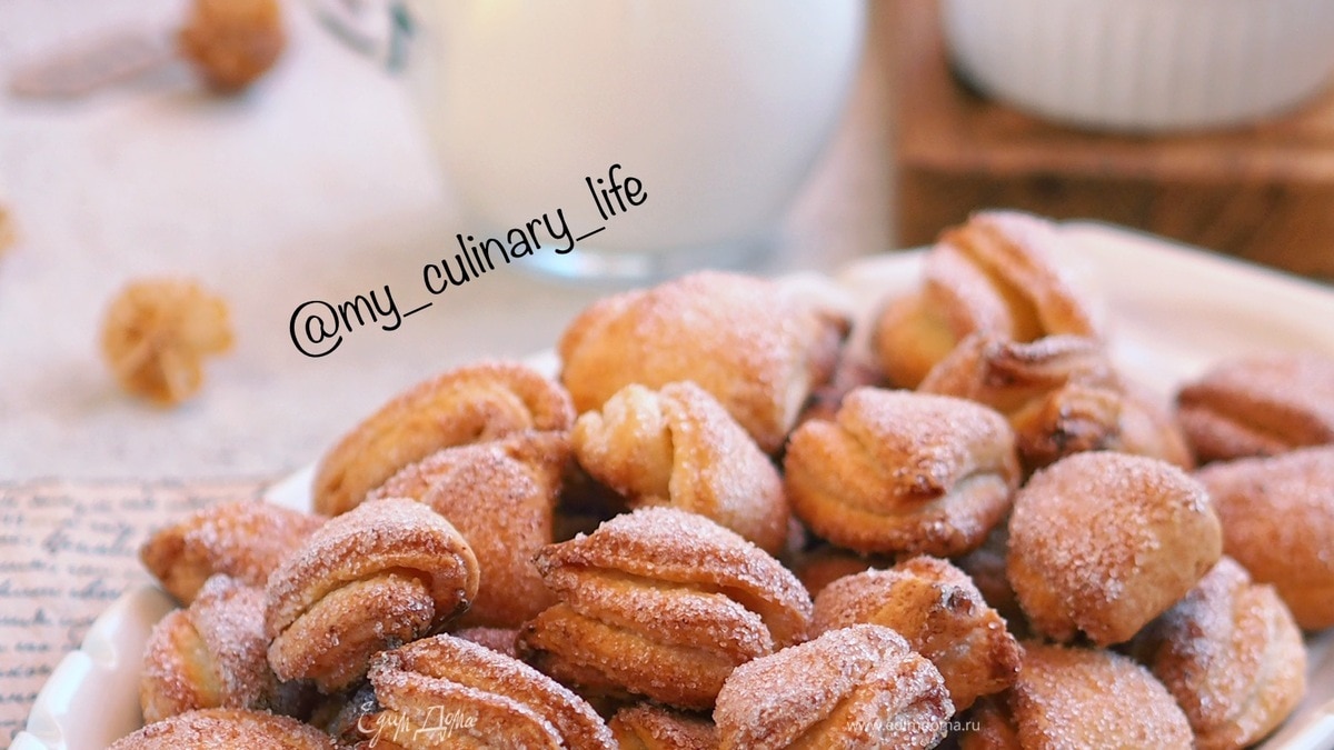 Муку смешать с солью и разрыхлителем, просеять. Холодное масло натереть на терке, добавить холодный творог и быстро замесить тесто. Чем меньше будет контакта с теплыми руками, тем лучше. Я все ингредиенты складываю в комбайн и замешиваю тесто без контакта с телом в течение 1 минуты. Разделить тесто на 2 части: с одной работаем, другую кладем в холодильник. Чтобы не забивать тесто мукой, можно взять 2 листа пергамента и раскатать между ними тонкий пласт, вырезать круги (у меня диаметр — 6 см). - Шаг 2