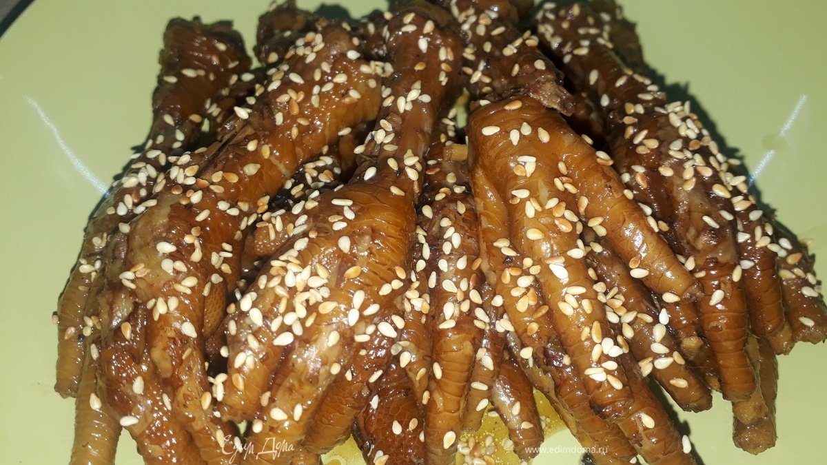 Готовые лапки выложить на блюдо, украсить кунжутными семечками. - Шаг 9Ингредиенты я подбирала на свой вкус. Если есть желание усилить — больше сладости, кислоты, жгучести — корректируйте.