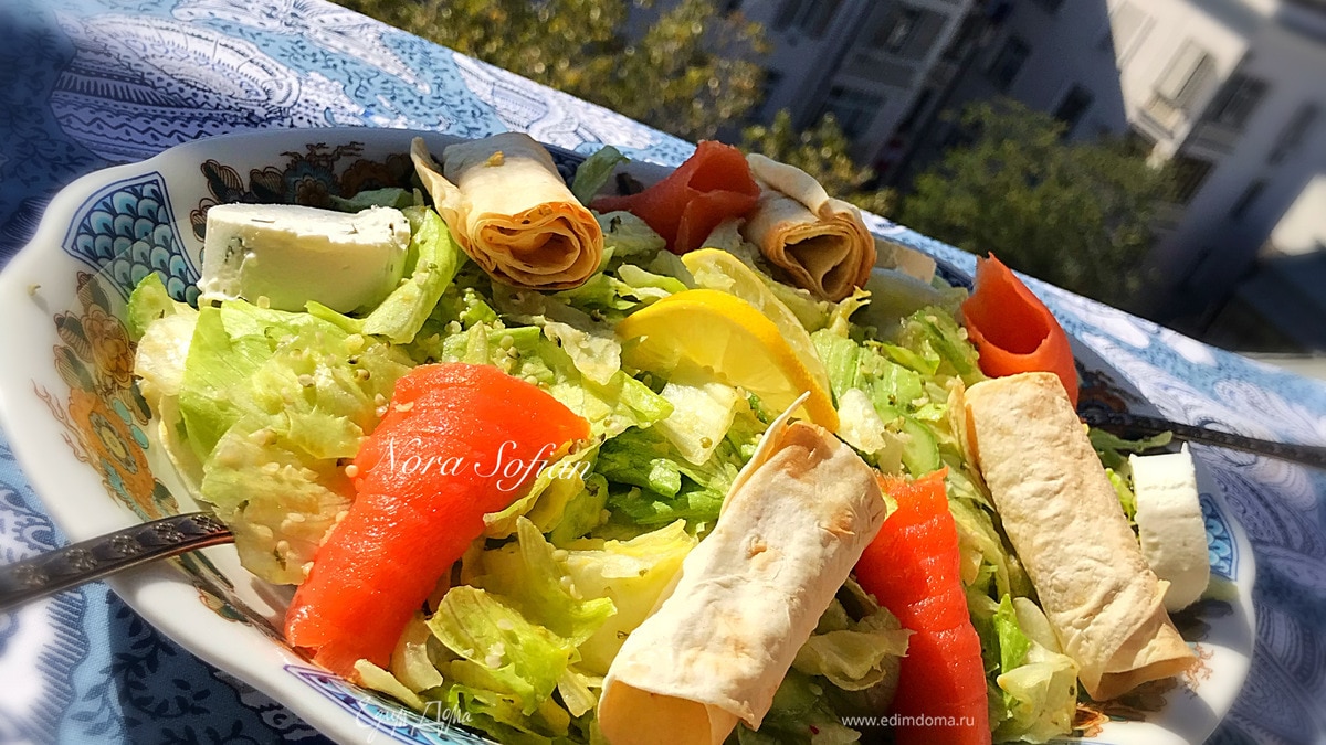 Очень вкусный, легкий и полезный салат с копченой семгой, козьим сыром и домашними чипсами.