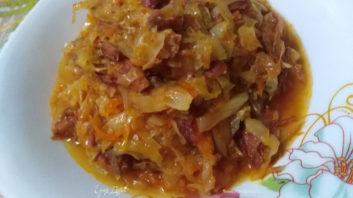 Капуста, тушенная с копчеными свиными ребрышками