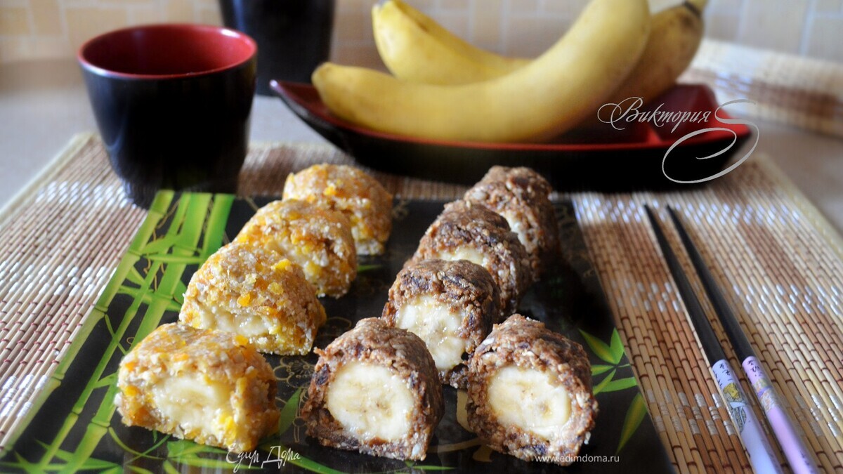 Выложить на получившуюся лепешку банан и плотно завернуть в рулет. То же самое повторите с массой с добавлением фиников.