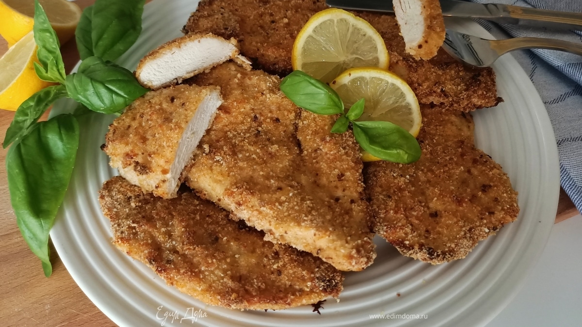 Поместить филе в йогуртовый соус и оставить мариноваться минут на 10–15. Затем каждый кусочек обвалять в панировочных сухарях.