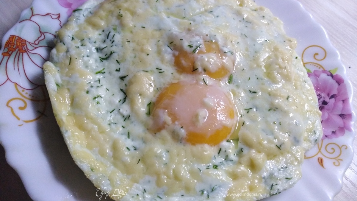 В разогретую сковороду со сливочным маслом выложить творожно-белковую массу. Посыпать натертым сыром. Сверху выложить желтки. - Шаг 5