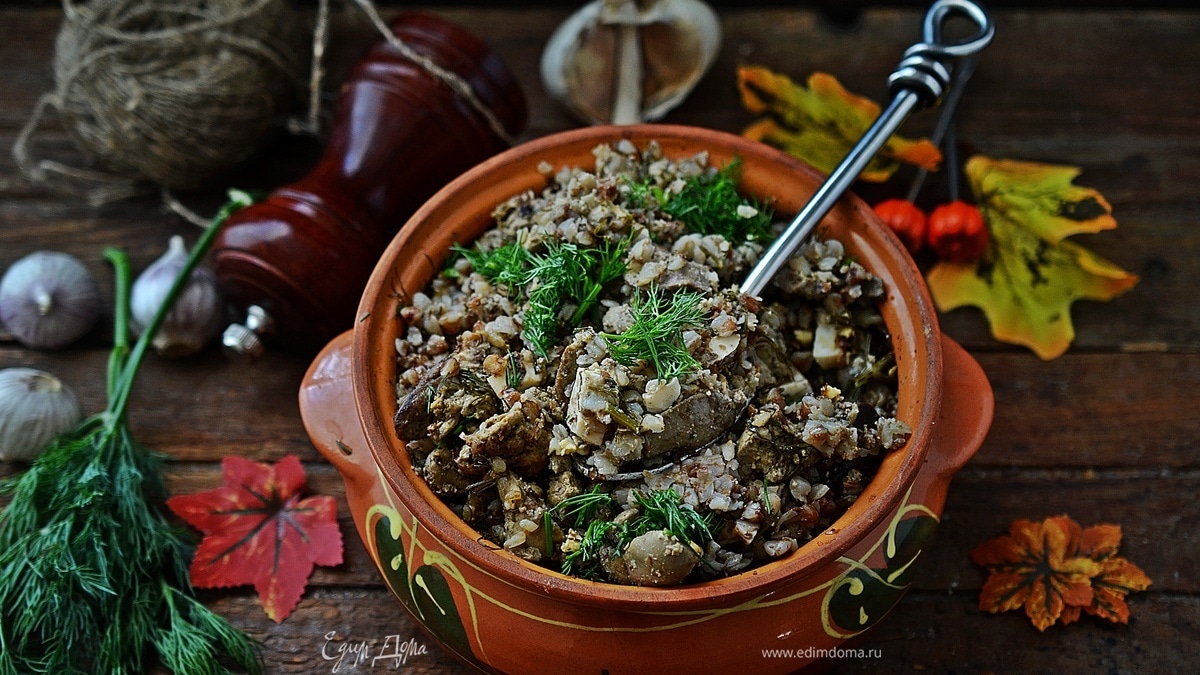 Выложите жареные потрошки в горшочек к гречке и аккуратно перемешайте. Уберите в духовку еще на 30 минут. - Шаг 9
