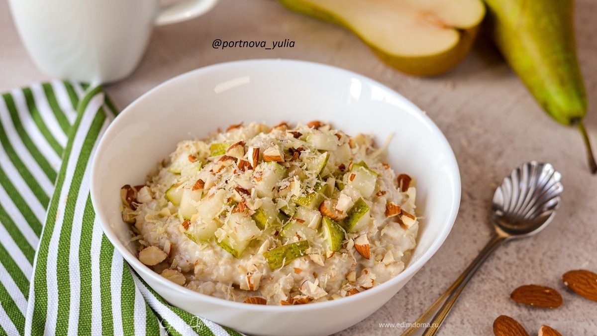 На кашу выложить грушу, посыпать орехами, полить медом и добавить щепотку сыра. Приятного аппетита!
