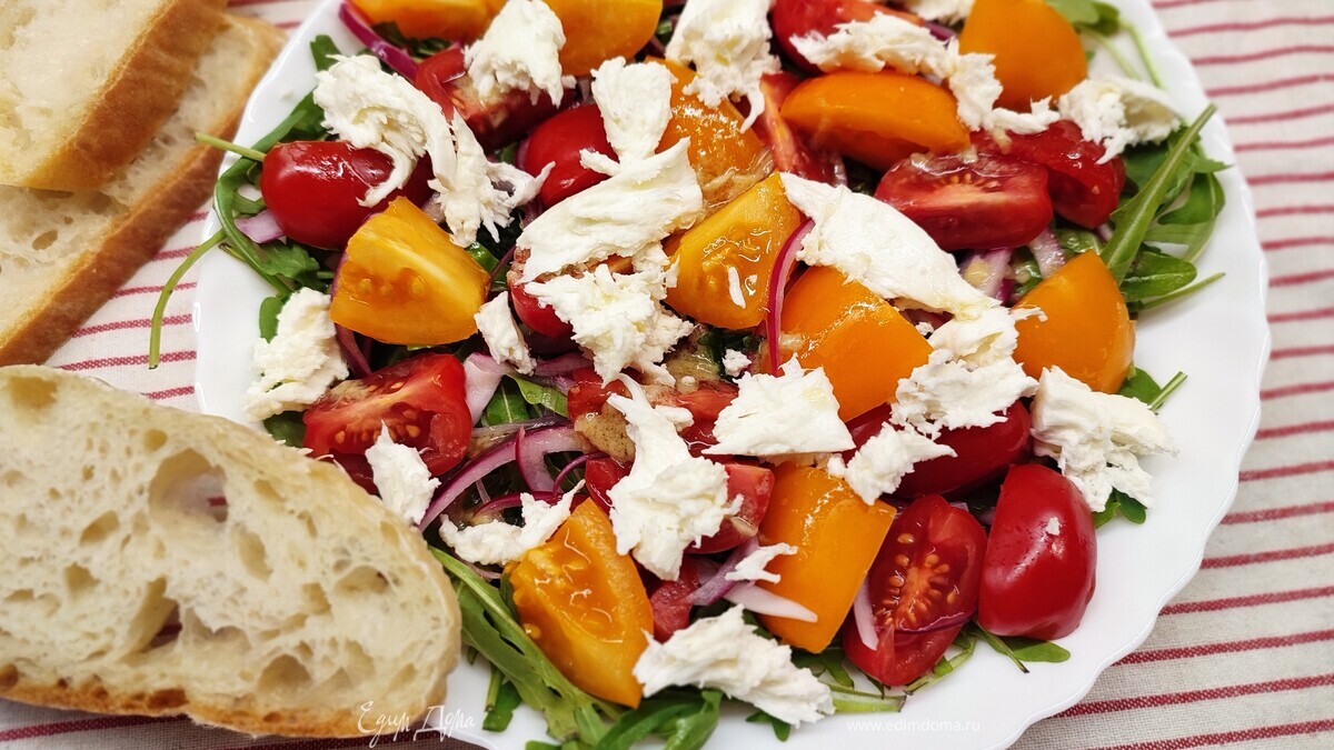 Полить оставшейся заправкой. Моцареллу порвать на кусочки. Охладить в холодильнике в течение 15 минут, и можно подавать к столу.