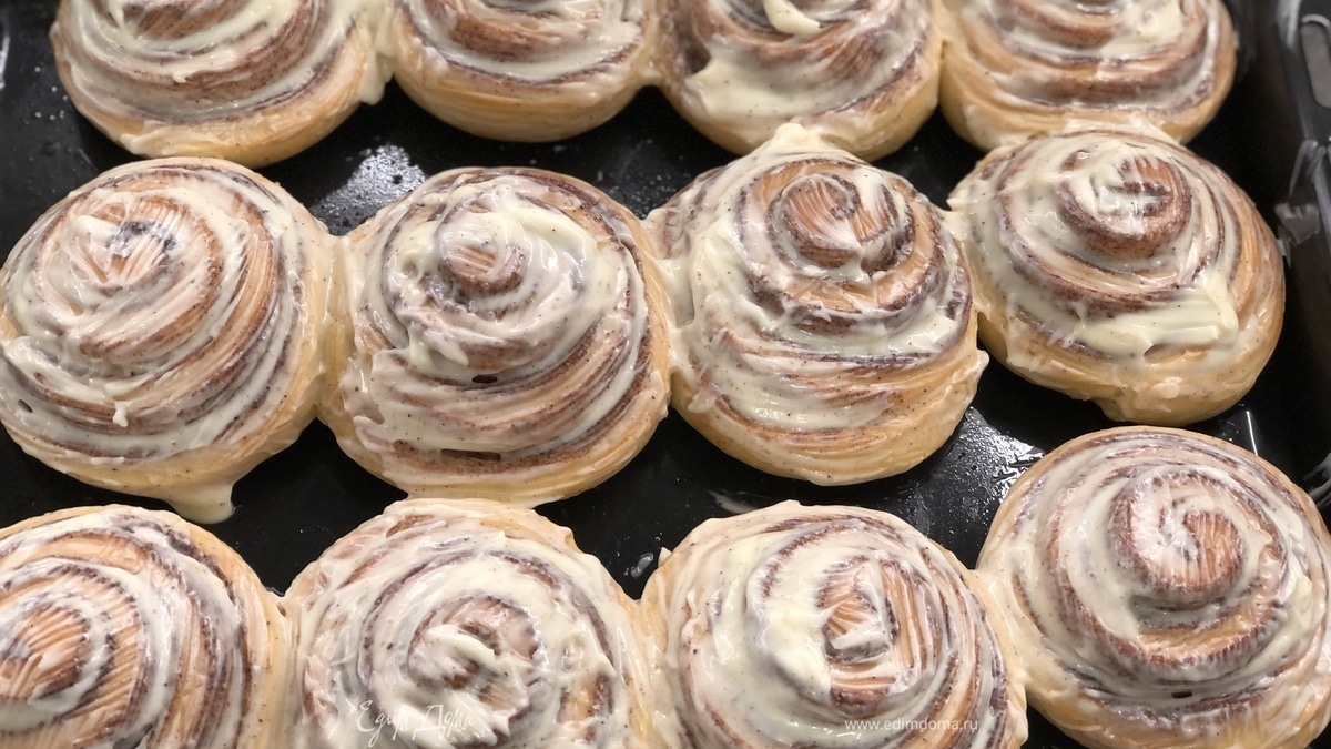 Пока булочки в духовке, готовим крем. Творожный сыр, мягкое сливочное масло и сахар взбиваем до получения пышной однородной массы, смазываем булочки сразу из духовки. Через 5–10 минут можно подавать! Приятного чаепития!