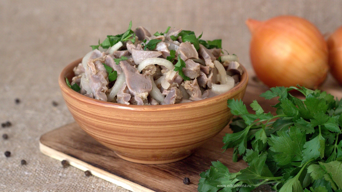 Поливаем растительным маслом, добавляем уксус 6%. Все хорошо перемешиваем и убираем в холодильник. Даем желудочкам промариноваться минимум 3 часа, лучше оставить их на ночь. Перед употреблением попробовать на соль, при необходимости досолить. Приятного аппетита!