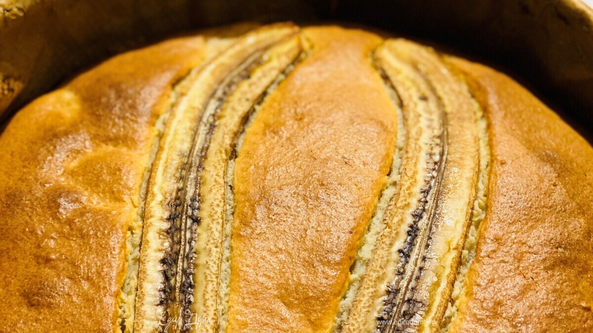 - Шаг 4Форму для выпечки смазать сливочным маслом, выложить половину теста, затем — слой из 2 бананов, нарезанных кружками, далее — оставшееся тесто. Верх пирога можно украсить бананом, разрезанным пополам.