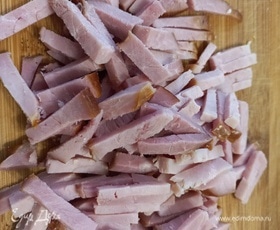 Копченое мясо нарезать брусочками. Для приготовления этого салата идеально подходит копченый окорок.