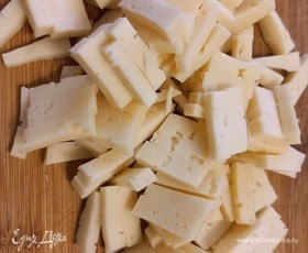 Сыр твердый нарезаем тонкими полосочками или кубиком.