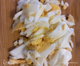 Яйца сварить, очистить и нарезать брусочками или ломтиками.