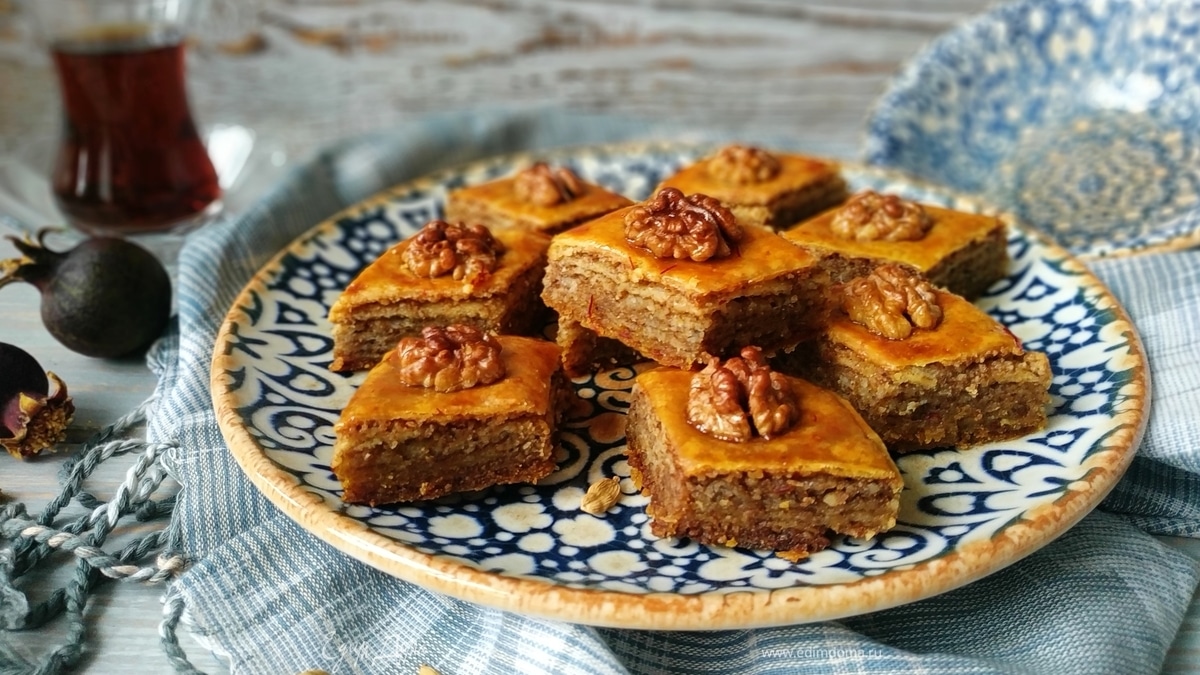 Пахлава из тонкого хрустящего теста с измельченной ореховой начинкой с кардамоном, пропитанная сиропом с пряным шафраном, будет украшением на любом столе.