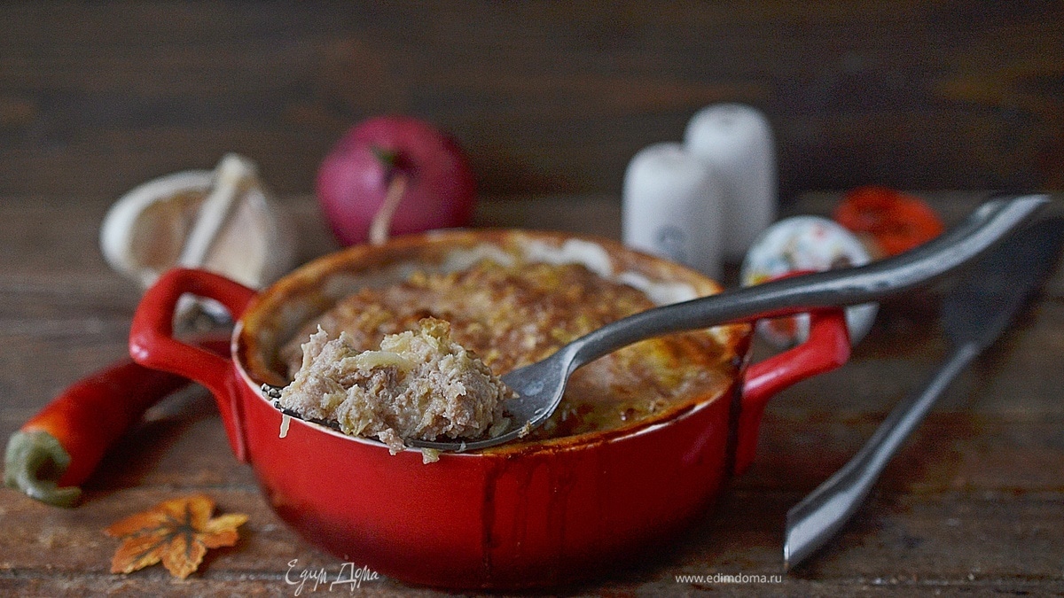 В жаропрочную форму выложите подготовленную массу. Запекайте в разогретой до 180°C духовке около 45 минут. Первые 30 минут накрывайте форму фольгой.