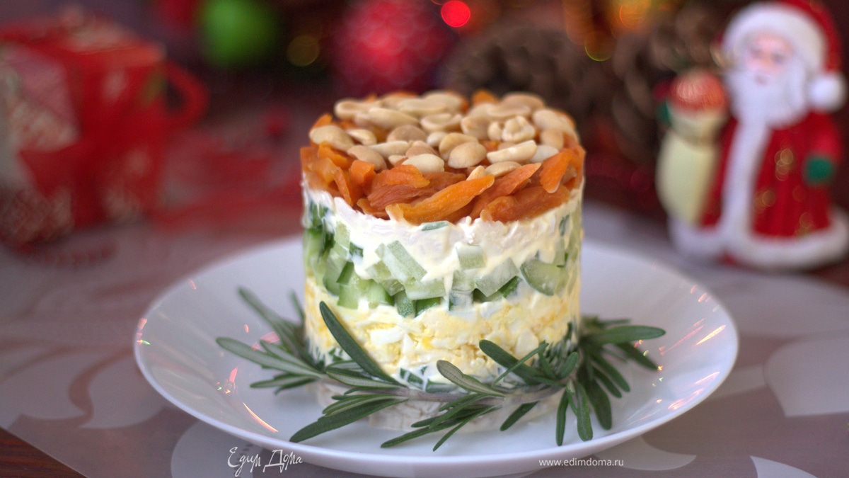 Слоеный салат с куриным филе, курагой и арахисом