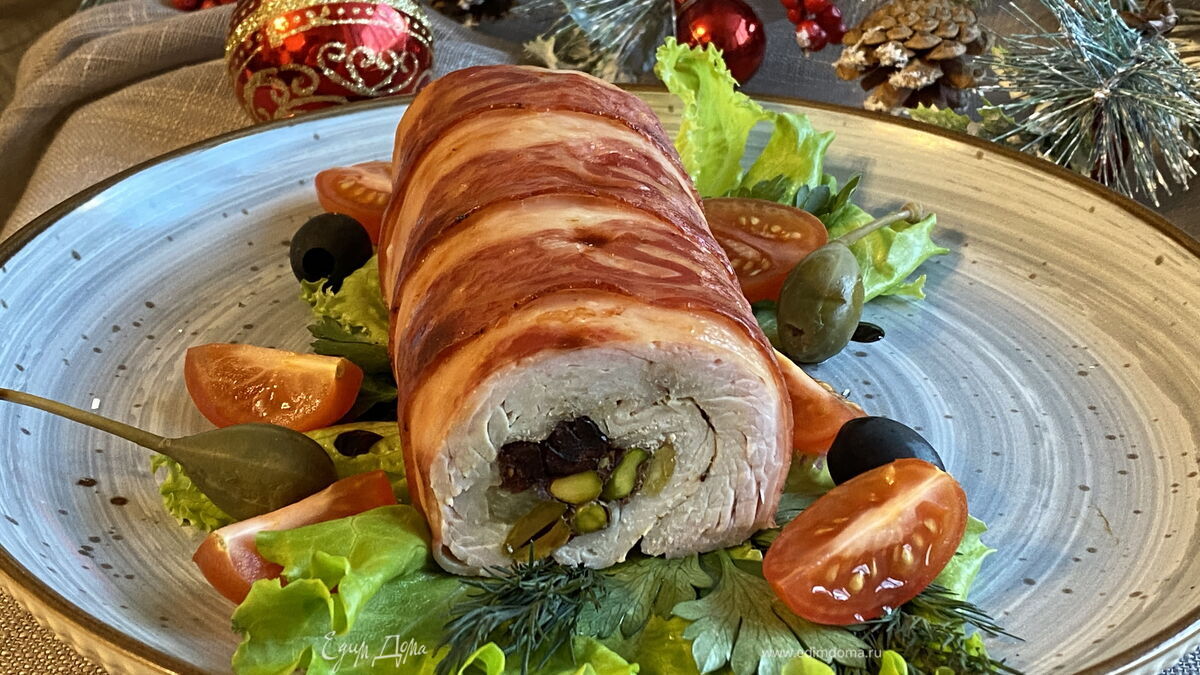Рулет из индейки с фисташками, ананасом и вяленой клюквой