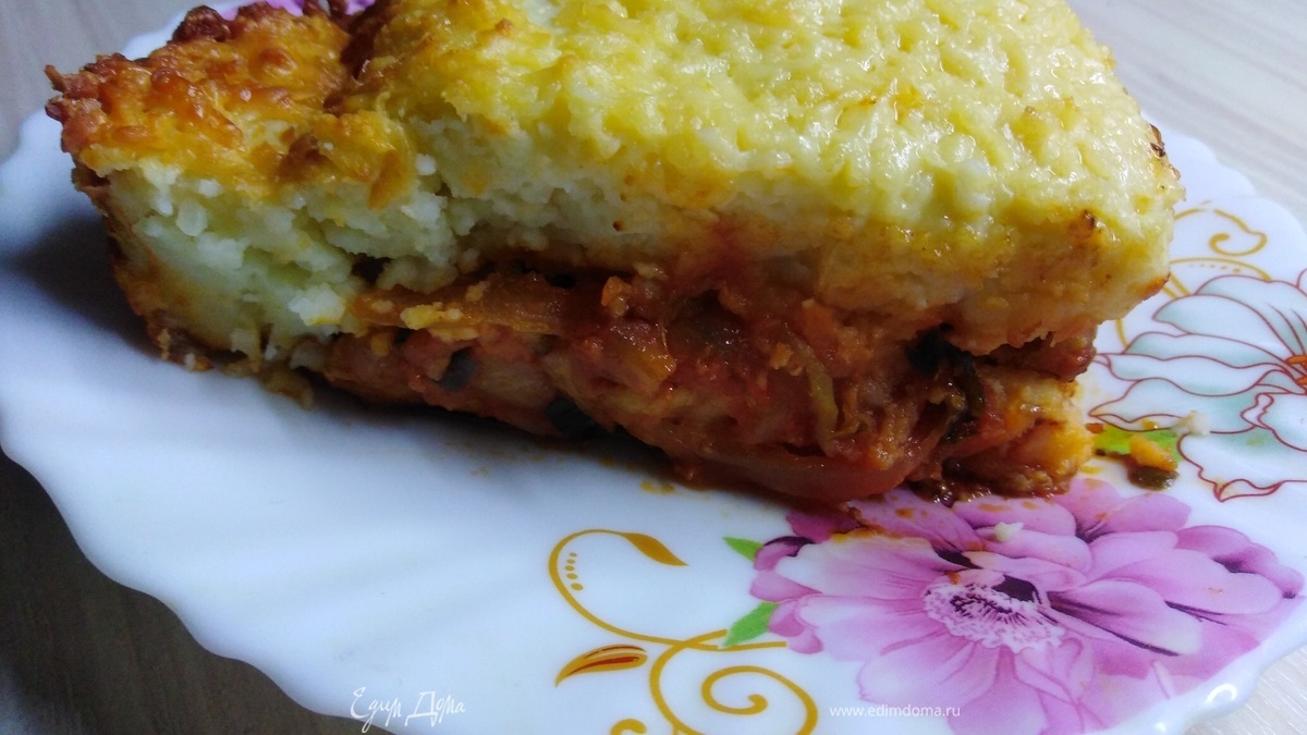 Картофельная запеканка со свининой и маринованными огурцами