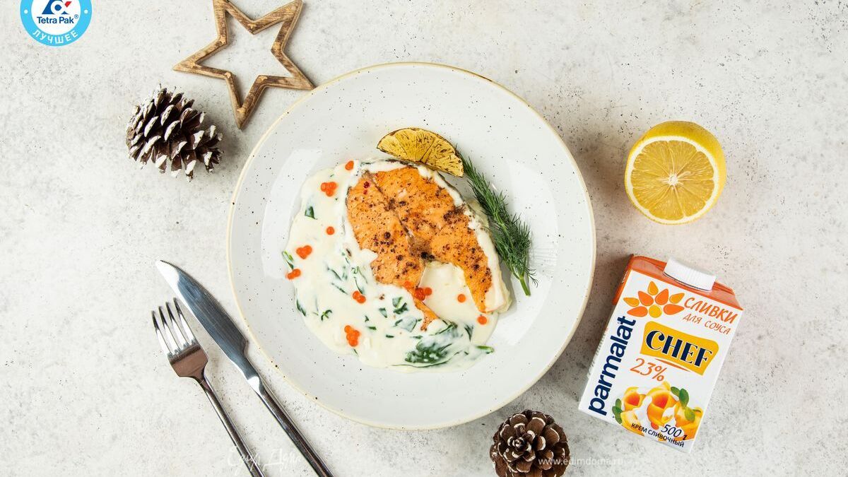 Жареные стейки семги со сливочно-шпинатным соусом