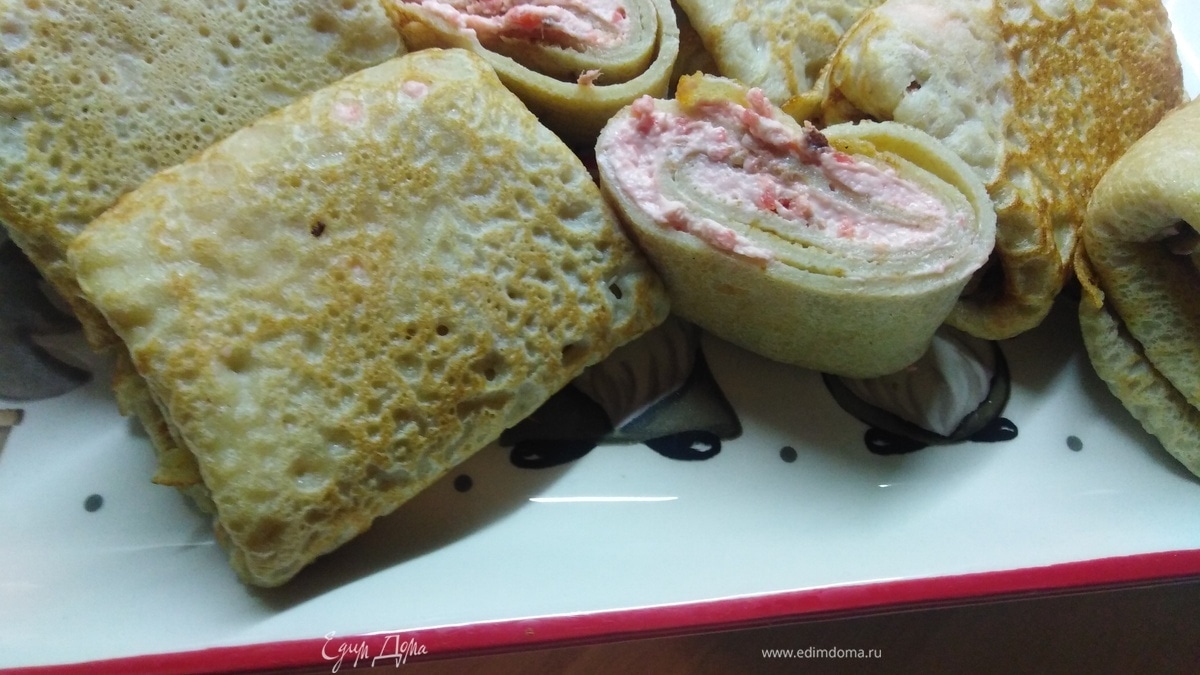 На сковороде обжарить блинчики с двух сторон. На край каждого блинчика выложить рыбный крем. У меня покупной, но можно приготовить самим или заменить на рыбный риет. - Шаг 5