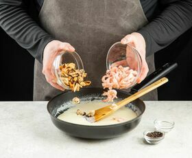 Влейте сливки Parmalat CHEF 11%, варите, помешивая, до густой консистенции. Посолите, поперчите.