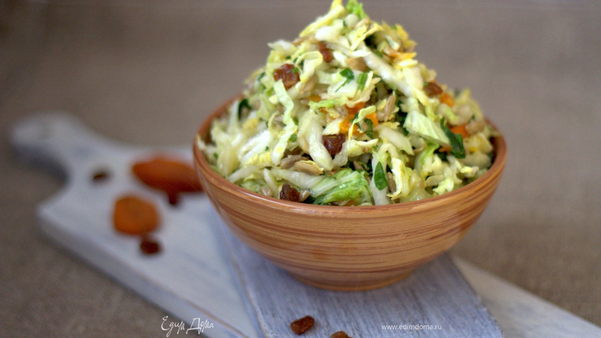 Семена подсолнечника промыть, обсушить и выложить на сухую сковородку. Постоянно помешивая, жарить до легкого румянца, как только семечки начинают трещать, выключить огонь и продолжать мешать еще 1–2 минуты, чтобы семечки не подгорели. В чашу с капустой выложить курагу, изюм, семечки, перемешать, попробовать на соль и досолить при необходимости. Заправить оливковым маслом, и можно пробовать. Салат подавать сразу после приготовления. Это очень необычно и очень вкусно!