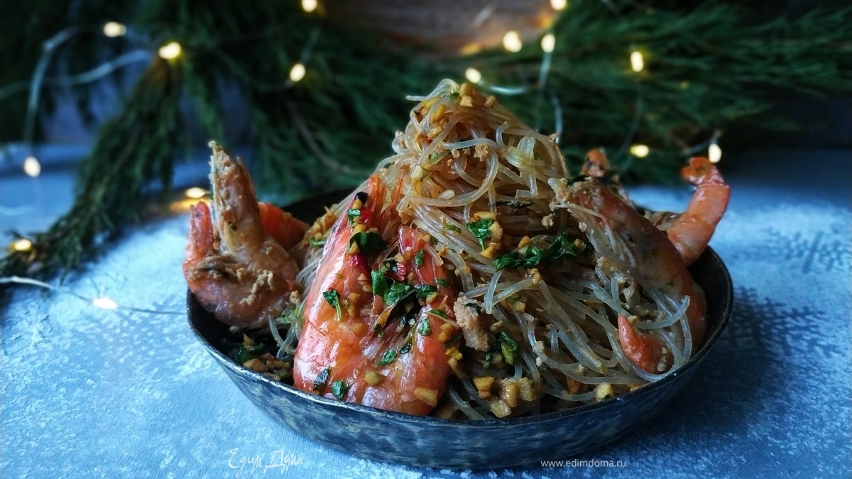 Фунчоза в пряном соусе с креветками и беконом