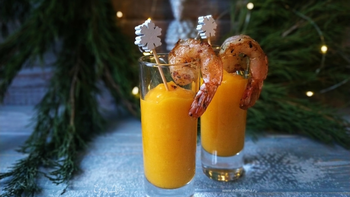обжаренную креветку. Можно манго нарезать на крупные кубики, а сверху шпажкой закрепить креветку. Подавайте к столу. Счастливых новогодних праздников!
