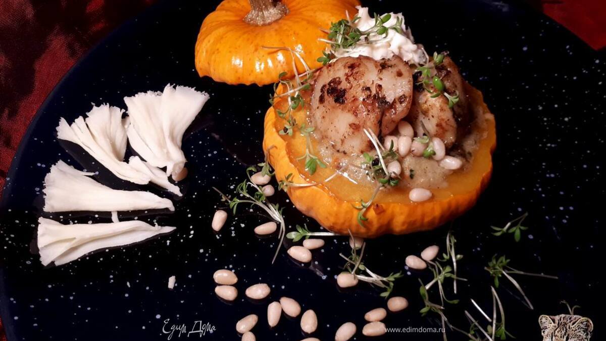Грушевый крем отлично оттеняет вкус морских гребешков. Получается нежная горячая закуска. Для большего эффекта и вкуса предлагаю вам подать гребешки в мини-тыквах.