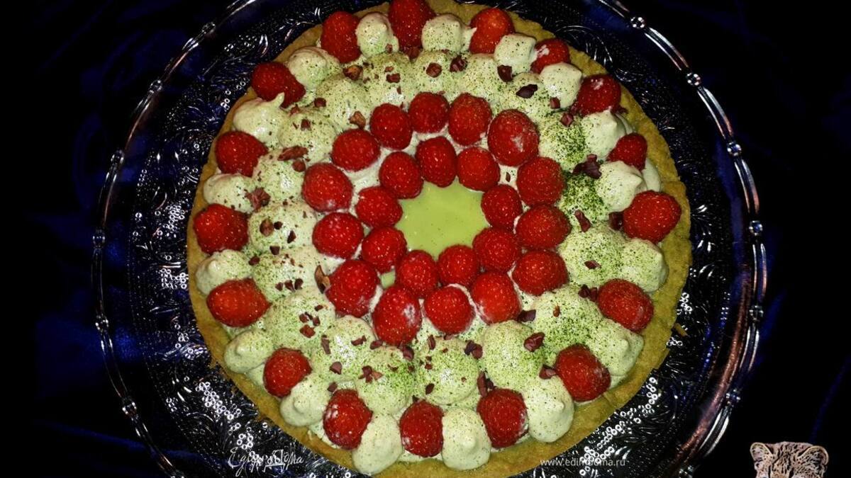 Когда ганаш загустеет, выложите сверху грушевый мусс. Украсьте малиной, рублеными какао-бобами и посыпьте сверху матчей.