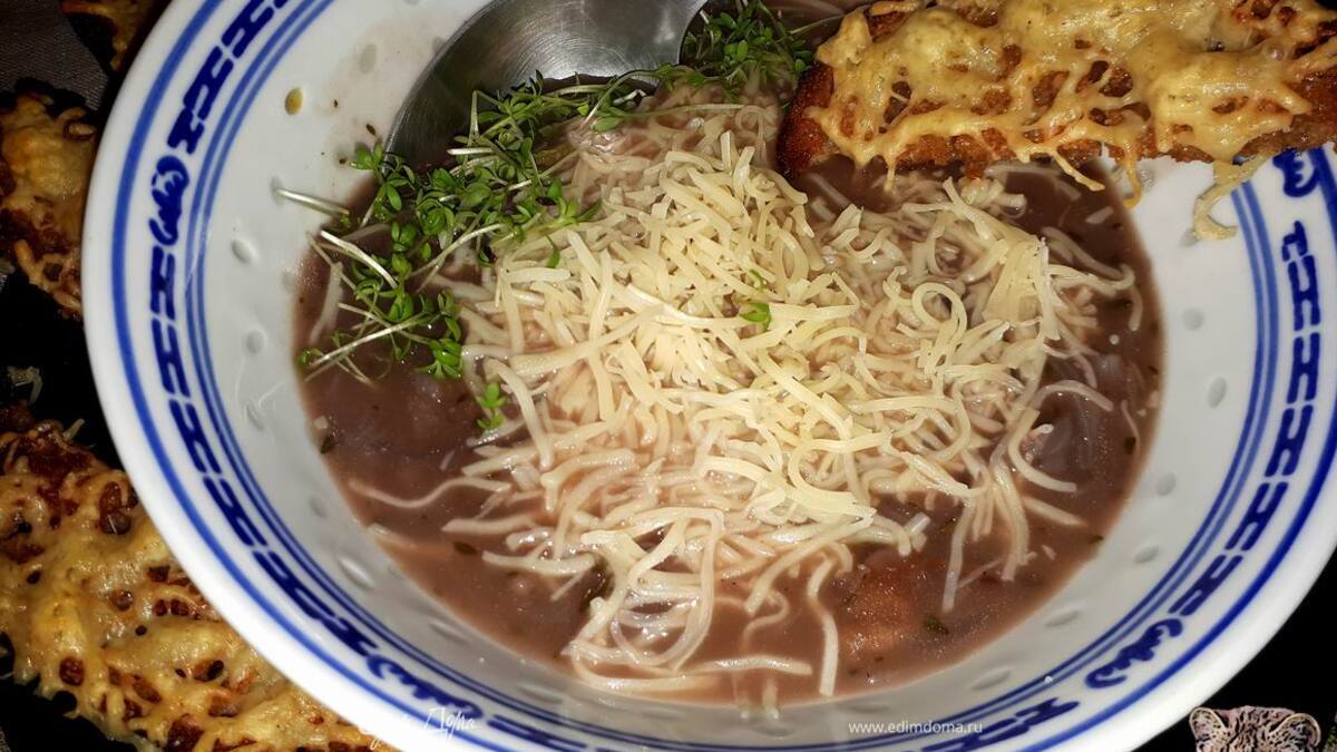 Обычно луковый суп готовят с белым вином. Я предлагаю вам попробовать суп с красным вином — оно придает очень приятный цвет и вкус. Для совсем утонченных гурманов существует вариант с шампанским.